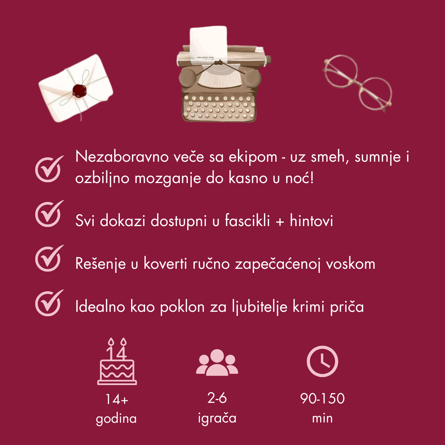 Vaš zadatak je da kroz tragove, dokaze i sitne pukotine u pričama osunjičenih otkrijete ko je u ovoj igri znanja i zavisti otišao predaleko.